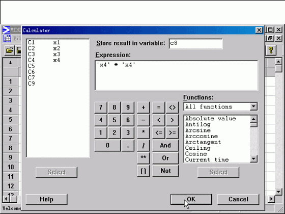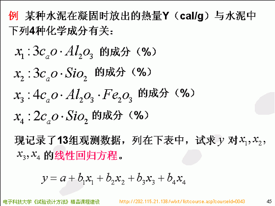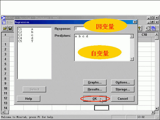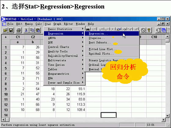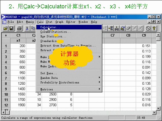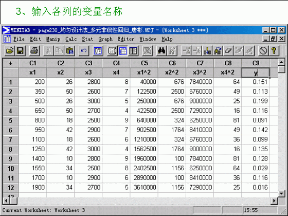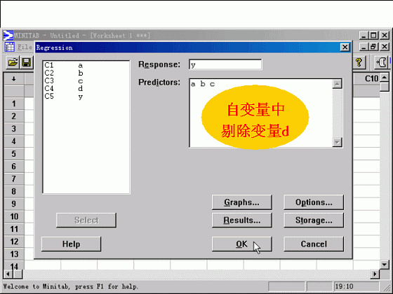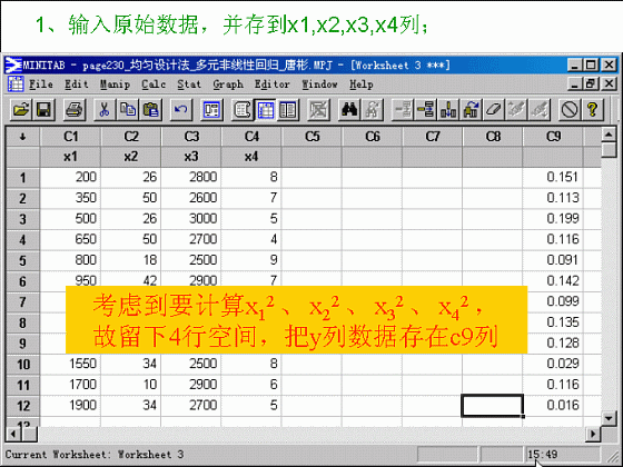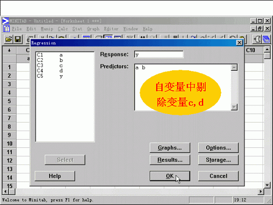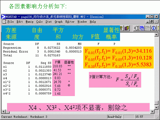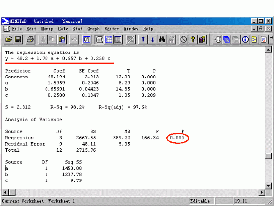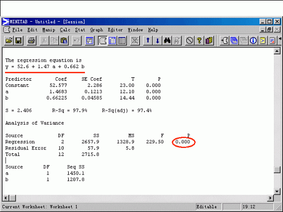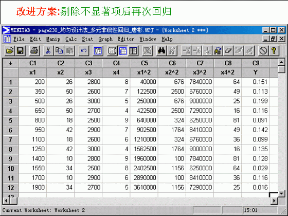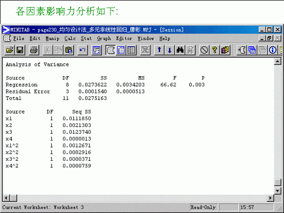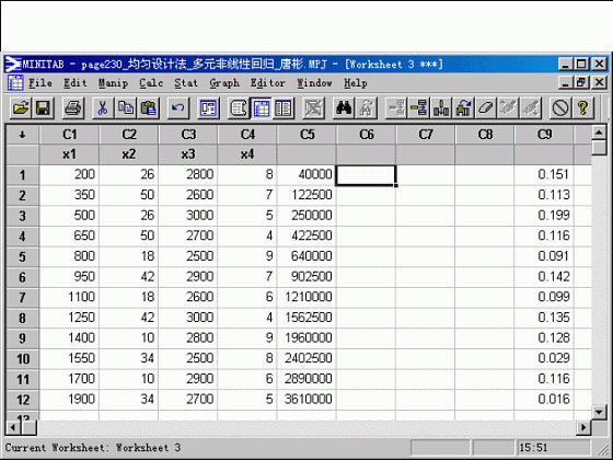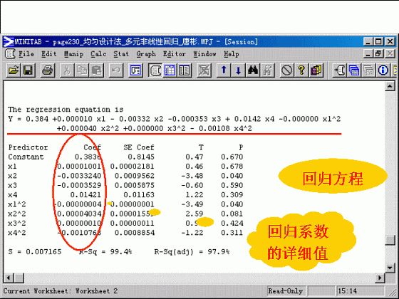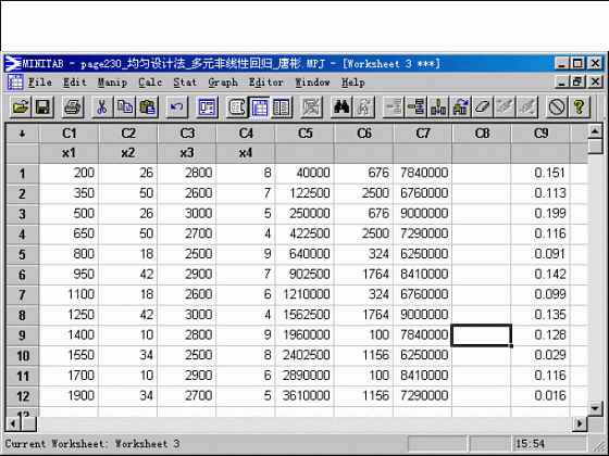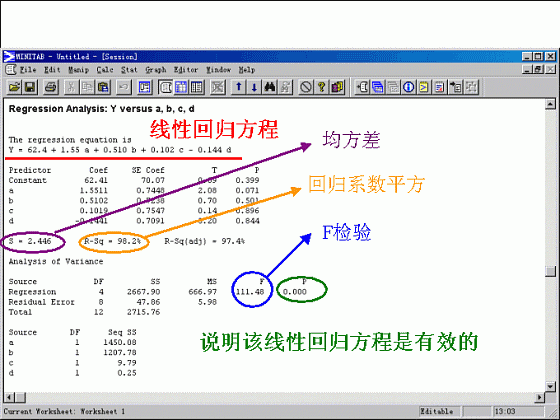 这是一个多元线性回归问题,具有4个一元变量,我们可以用minitab来得到回归方程并分析结果,具体操作步骤如下: