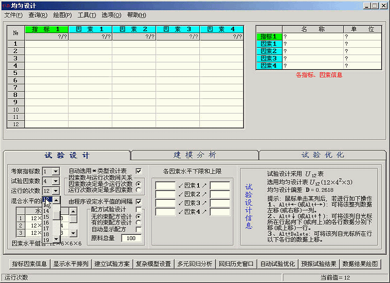 在“试验设计”栏目依次选择“考察指标数为1,试验因素数为4,运行的次数(即试验次数)为12。