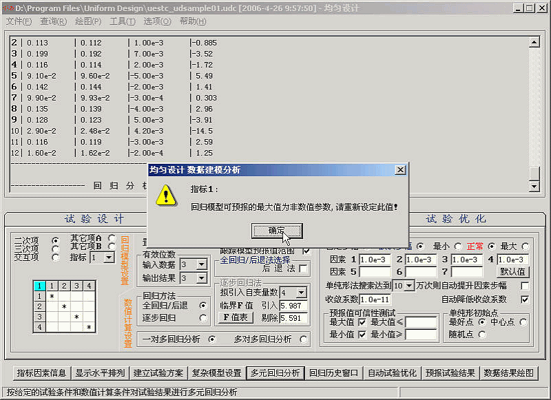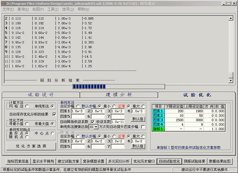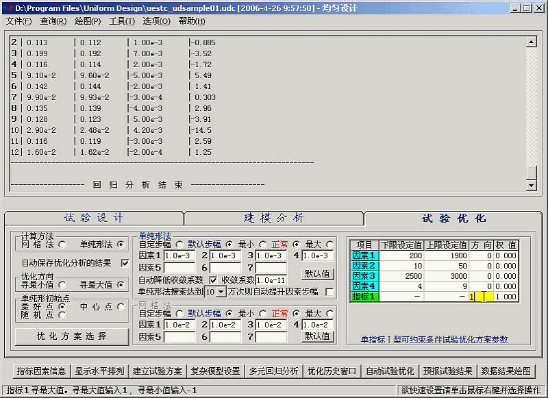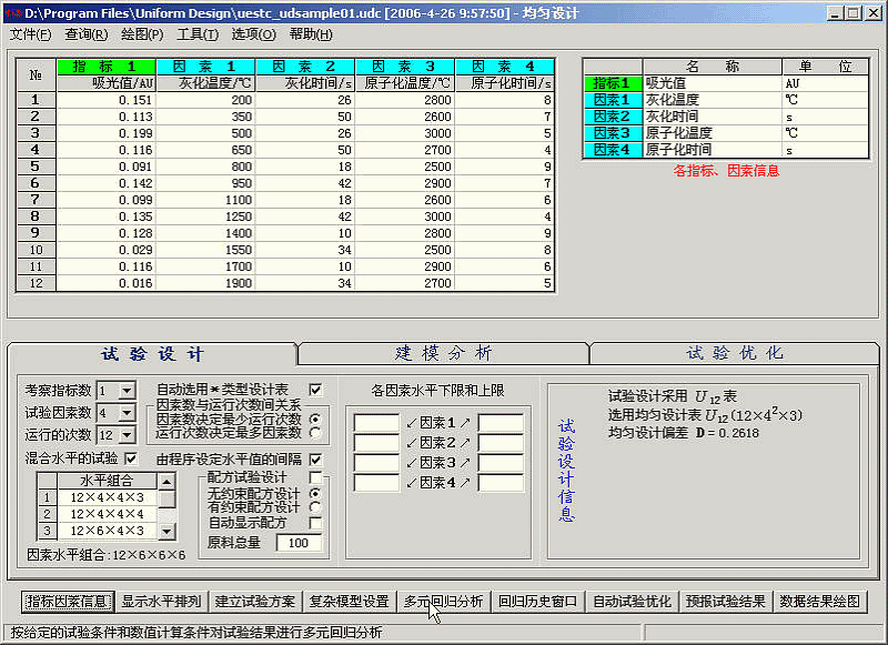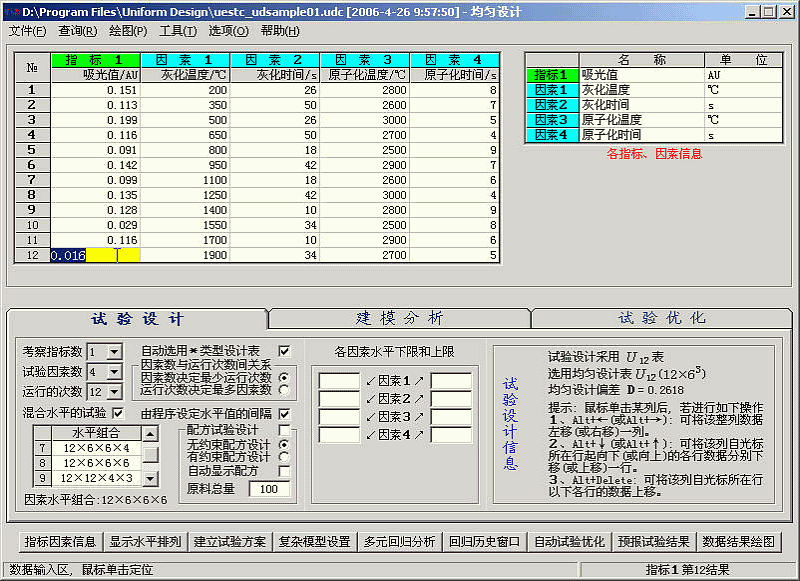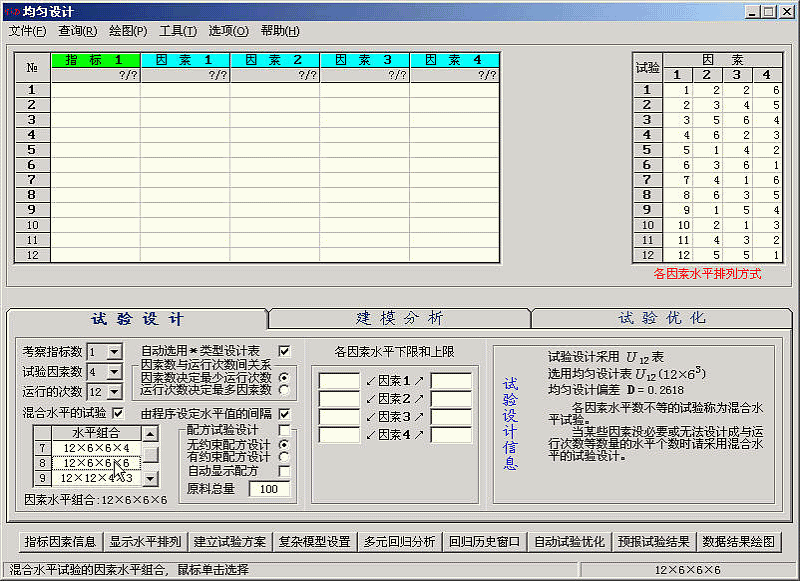本例子采用的混合水平的均匀设计表的水平排列方式与方开泰先生所著《均匀设计与均匀设计表》, 科学出版社, 1994 中给出的混合水平的均匀设计表U12(12X63)的水平排列方式不同。故需要手动输入指标因素的数据。