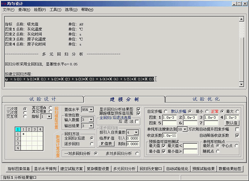 例 9-1 在石墨炉原子吸收分光光度计上用均匀设计试验法选择测定微量钯的工作条件。已知影响钯吸光度的主要因素有灰化温度(X1)、灰化时间(X2)、原子化温度(X3)和原子化时间(X4)。由原子化机理可知, 灰化温度和原子化温度对吸光度的影响可拟合为二次函数, 即回归方程中应有X12和X32两项。两因素发生在不同时间, 因此不存在交互作用, x1x3项可不列入回归方程; 灰化时间和原子化时间的影响比较复杂, 但也用二次多项式逼近, 忽略其交互作用, 方程中有x22和x42项。加上一次项, 回归方程系数个数为8, 至少应安排9次试验才能求得各系数。根据实际经验选择的各因素的水平值如表1所示。