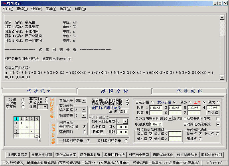 分别选中1X1、2X2、3X3、4X4的交互项,请注意上方“拟建立回归方程”会实时变化。