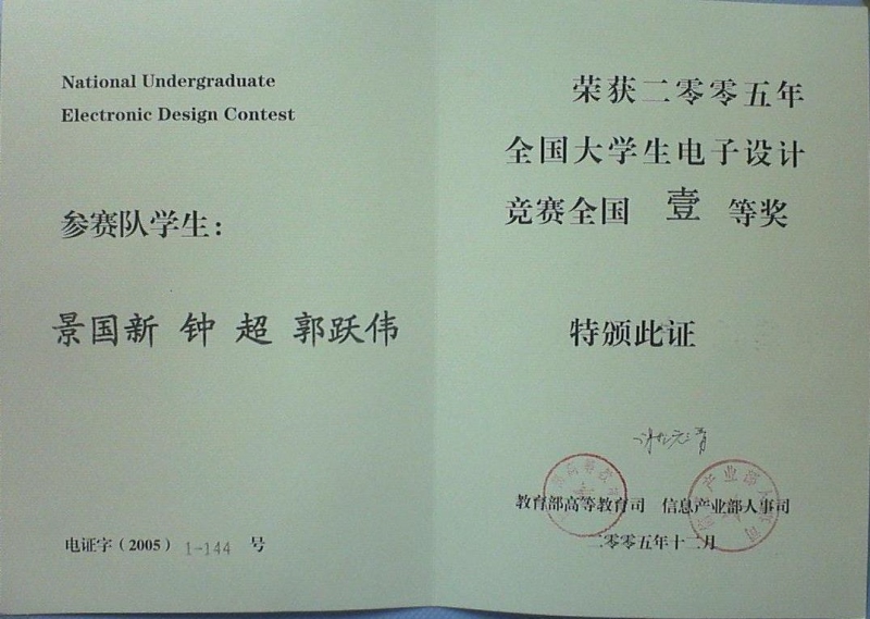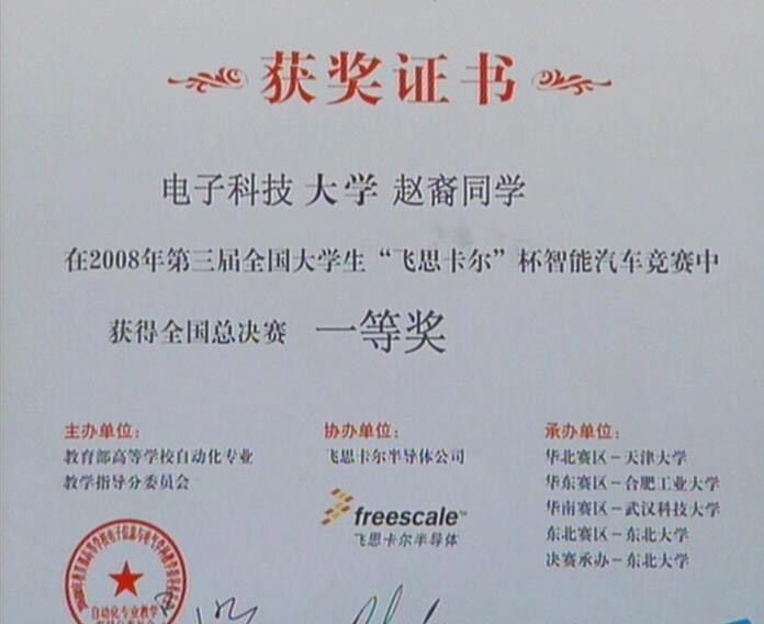 2005年全国“电子设计”竞赛一等奖 | 2008年全国智能汽车竞赛一等奖 |